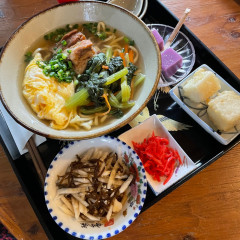 沖縄そば処 まんぞく家(沖縄県島尻郡)めんそーれ!おじぃ手作りの沖縄そばは、つるつるもちもちするように作ってあるよ。ラーメンもつるつるもちもちで、小麦粉の中に「秋ウコン」入れて作っているから元気になるよ。だから「元気ラーメン」という名前をつけたよ。ソーキは豚軟骨で3日間炊き込んであるから肉より軟骨が柔らかいよ。スープはかつおベースだよ。ぜひ一度食べにおいで。